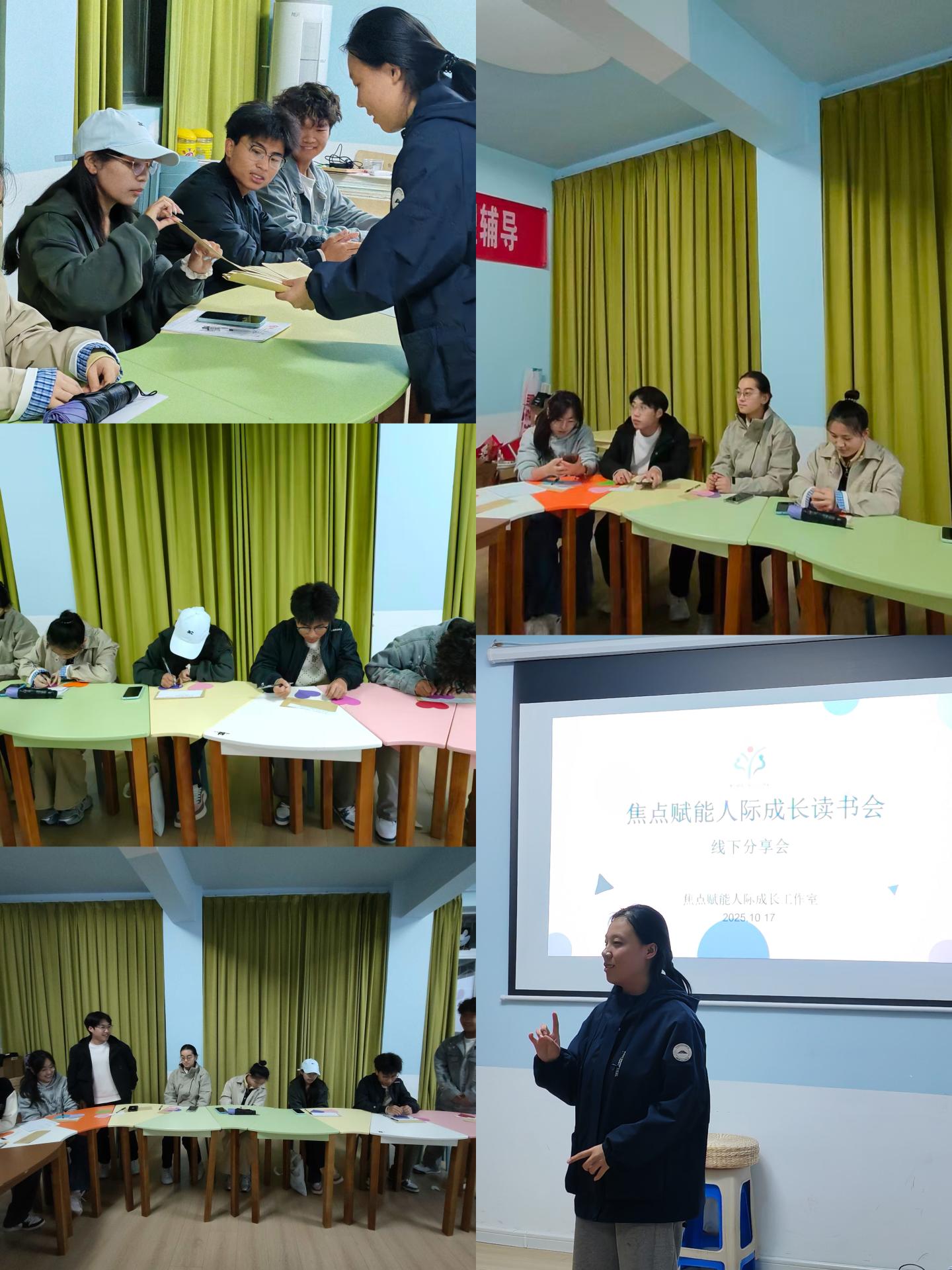 10月17日,焦点赋能工作室以“墨香邻舍,页间拾光”为主题,在心理团辅室开展“听见语言的温度—《非暴力沟通》共读与实践”线下读书会,吸引众多学生参与。